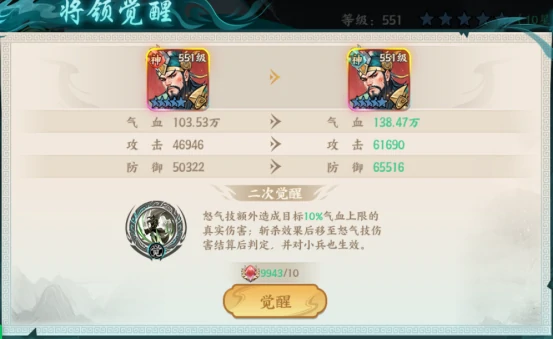 初次觉醒:消耗10颗觉醒石,武将获得“神”字标识。