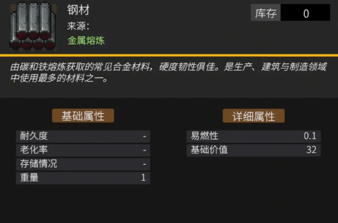 钢材是一种由铁和碳通过金属冶炼得到的常见合金材料。它不仅坚固耐用,拥有出色的硬度和韧性,而且是建筑、生产和制造过程中必不可少的资源。几乎所有高级装备、建筑物以及重要加工设施的制作,都需要钢材的支持。这也意味着,钢材在秩序新曙光中的需求量非常大,且无时无刻不在推动着你的科技树不断前进。从实用性上看,钢材虽然在外表上并不显眼,但它是让你从基础生存向高端生产过渡的重要桥梁。