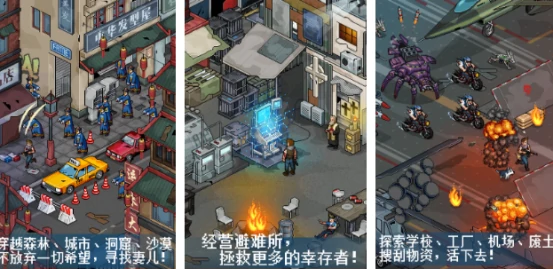 像素美术风格末日生存冒险游戏。城市沦陷,变异怪物横行,主角妻女失散。拯救城市,寻回家人,投身战斗,体验割草快感。优先保证生存,搜集必需品与食物,建立加固避难所,招募幸存者,共同抵御怪物侵袭。