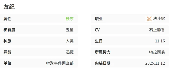 友纪定位明确,是兼具远程爆发与控制能力的核心输出角色。常规副本推进时,使用爆裂箭雨清理小怪维持场面稳定;Boss战中,配合潜行与死神一击对关键目标造成巨额伤害。该角色优势在于单体杀伤力极高,同时带有生存与回复技能,对抗强力敌人时既能打出高额伤害,又能保证自身存活。