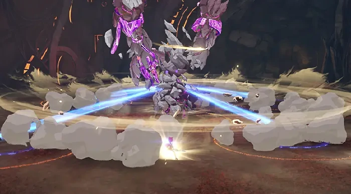 裂石风暴是持续环境技能,Boss旋转释放环形沙尘气流,不断外推队员。部分区域推力极强易致角色跌落,应迅速靠近最近遗迹装置,站入蓝色增益圈,获取移动速度加成,配合向Boss方向移动抵消推力,防止被推落。可利用场内石柱、断墙等障碍物卡位,减缓移动。