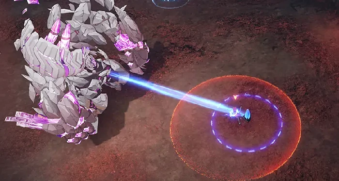 Boss碎地重拳技能锁定一台遗迹装置,生成矩形高额伤害区域。被锁定装置无法移动,需至少5名队员站入区域分摊伤害,否则触发防御反制,造成额外伤亡。技能带强击退,建议利用场地高低差或墙体阻挡击飞,避免队员掉落平台。
