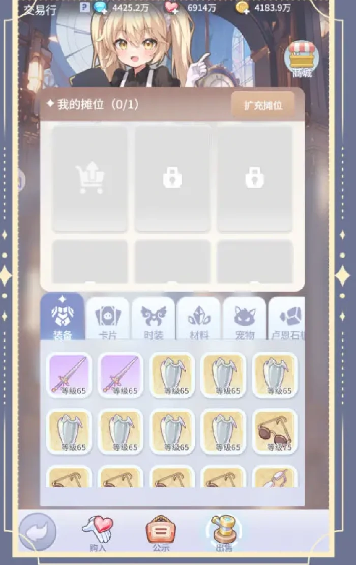 交易行分两种模式。普通商品交易用游戏内水晶,玩家可上架物品,设定价格与数量等买家,也能消耗水晶直接购入普通装备、养成素材和日常消耗品等。