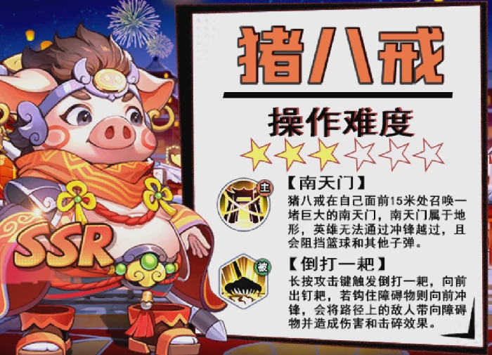 猪八戒:长按普攻蓄力,使钉耙变大后突进撞击敌方建筑物,打乱阵型、阻挡进攻;创造固定屏障区域,全面防御各类飞行投射物,充当防守支点。