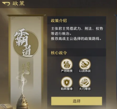 九牧之野政策系统分霸道、王道、衡道三条发展路线,助玩家规划策略。新手可选对应路线匹配发展需求。