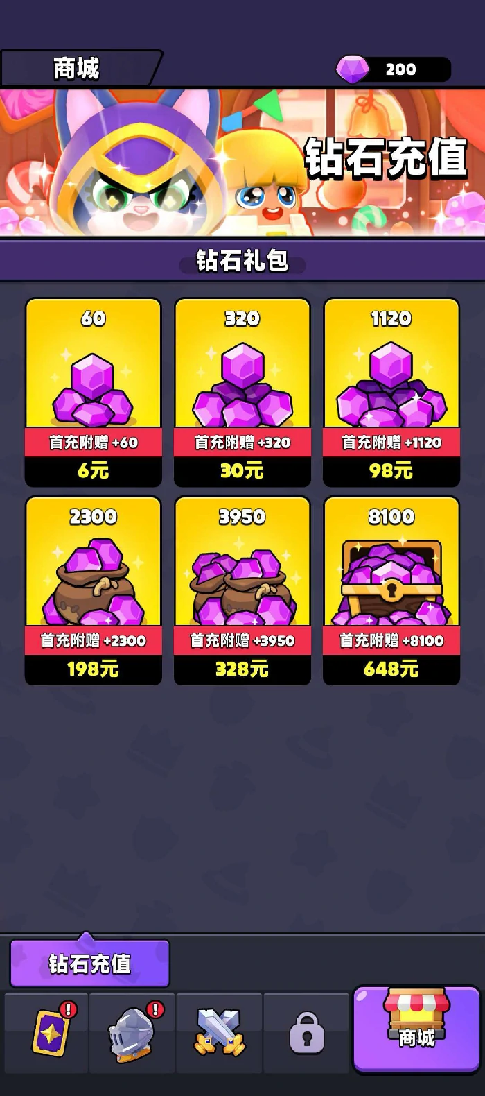 英雄招募靠抽卡,用抽卡券或钻石。抽卡券通关获取,券不够可用钻石补。钻石需充值,设多种档位礼包,共6级,充值越高额外送钻越多,按需选择。