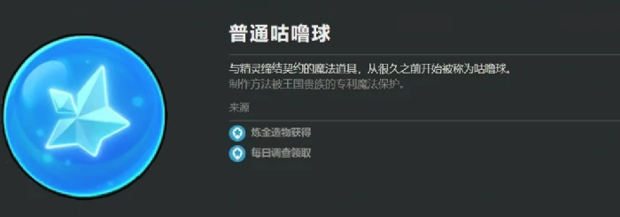 普通咕噜球:蓝色透明球,中间嵌星星。炼金台消耗矿石和体力合成,每日按魔法师等级领取。用于初阶精灵,削弱目标血量至较低水平,一两颗即可捕获。