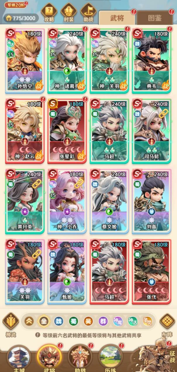核心武将先升六星,解锁关键技能,比如关羽、吕布。S+级武将留住,别因材料不够卡等级。新手先用过渡阵容,像关羽、张飞、诸葛亮、貂蝉、小乔混搭,搭配好战力不弱。