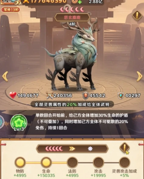 中期队伍阵容成型,选灵兽要和阵容互补。用玄鹿、麋鹿提升生存,BOSS战、竞技场里,复活或护盾能改变战局。玄鹿闪现拉人,救濒危武将并回血;黄金兽有威慑,削弱敌方输出、提升自身攻击,高速功能或爆发输出路线都能融入阵容。