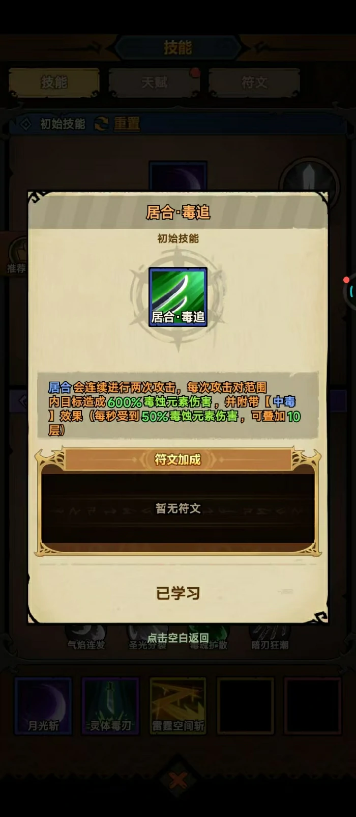技能树加点专注毒素强化分支。初始技能选月光斩、居合及居合追,冰霜连斩、居合暗破这类非毒系分支别投入资源,优先把居合毒追伤害和攻击次数升满级。主宰、守护技能按成长阶段调整:前期等级低、伤害不足,主宰技能选裂霜延展,给敌人附加易伤,放大中毒伤害,平稳度过前期。后期等级提升,换风行者,提高移速和攻击频率,跑图更快,跟首领周旋时灵活调整站位。
