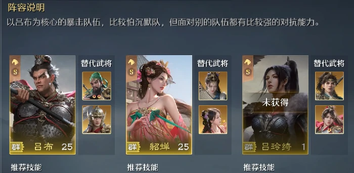 版本强势武将:吕布搭小吕布+貂蝉,霸业群雄割据/万军起将活动抽对应卡包拿后两者,技能带诸葛连弩+夺神阵+猛烈强击。曹操技能全了能用,中后期发力。