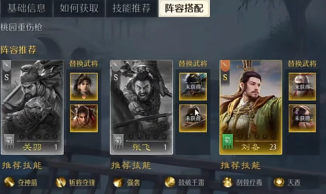 桃园队技能搭配:关羽带霸王反戈+八师破金,刘备必带坚阵合一(减伤+护盾),张飞用新州军+列阵御敌,堆反击和防御,稳扎稳打降战损。