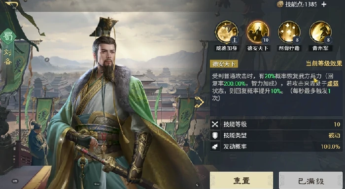 被动技能德安天下,巩固辅助定位。普攻20%概率回血,目标虚弱,概率再提10%。每秒触发一次,普攻频繁,各种战斗都能稳定续航。