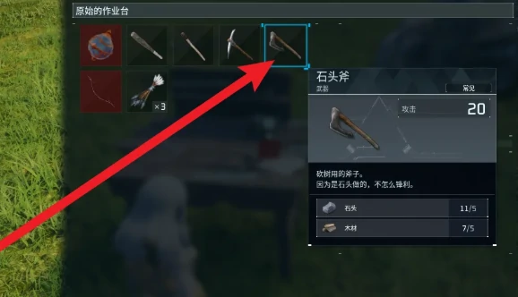 2. 在配方列表选中石斧,查看20攻击力属性及材料需求,确认背包数量是否足够,缺材料及时补。