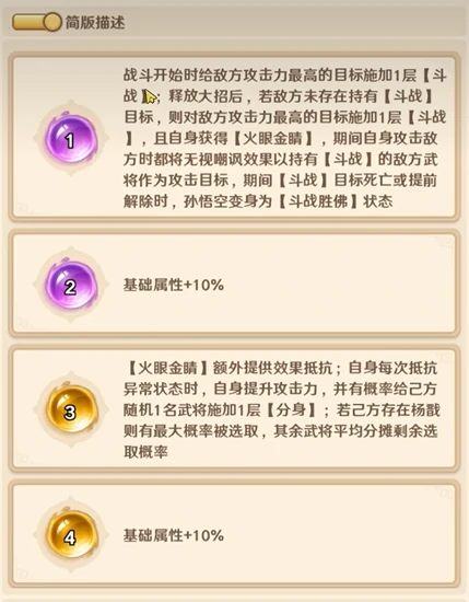孙悟空投入资源回报可观,属成长型武将,需围绕暴击率、暴击伤害和怒气获取综合培养。单体高强度战斗场景(世界BOSS战、精英副本首领战)表现突出,是攻坚队伍终结者。规划发展路线,提升团队战术适应性和极限输出能力。