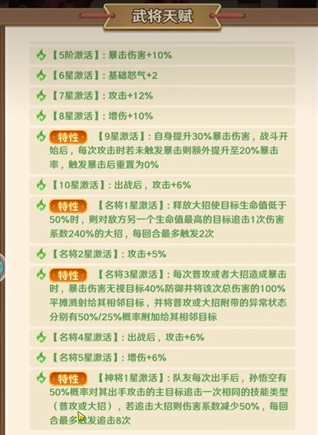 晋升名将1星,解锁核心收割天赋:大招将目标血量打到50%以下,自动对场上当前生命百分比最高敌方单位发动追击,造成240%伤害,每回合最多触发两次,提升点杀能力和对敌方核心满血单位威胁,多目标战斗战略价值高。