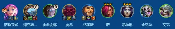 阵容构成:萨勒芬妮、海克斯霸王龙、发条、奥恩、洛里斯、蔚、女警、金克丝、艾克
