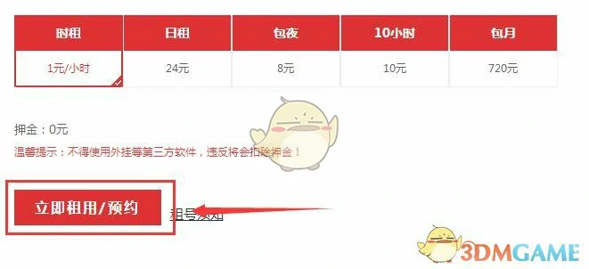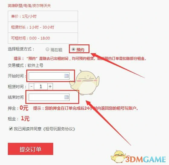 3. 预约最低3小时起租,手游账号暂不支持。需提前2小时操作,可预约正在出租账号未来3天内时段。解锁码需到预约时间方可使用。