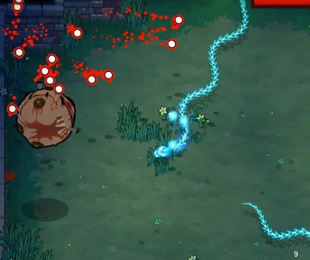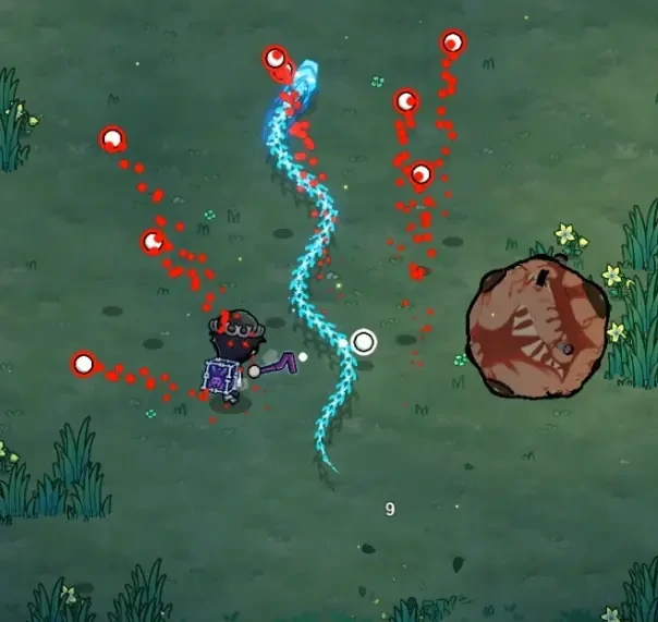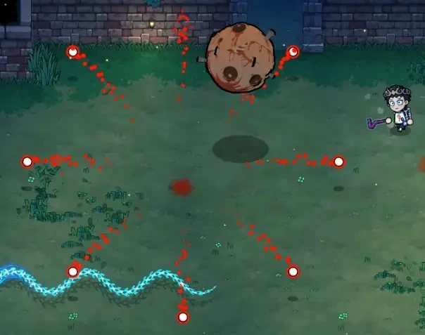 攻击方式二:跃起并在空中旋转,随后加速滚向玩家,撞击墙体后产生大量弹幕。