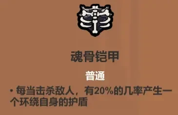 魂骨铠甲:击杀敌人概率获得护盾。推荐指数:★★★☆☆。能提供保护,但别过度依赖。