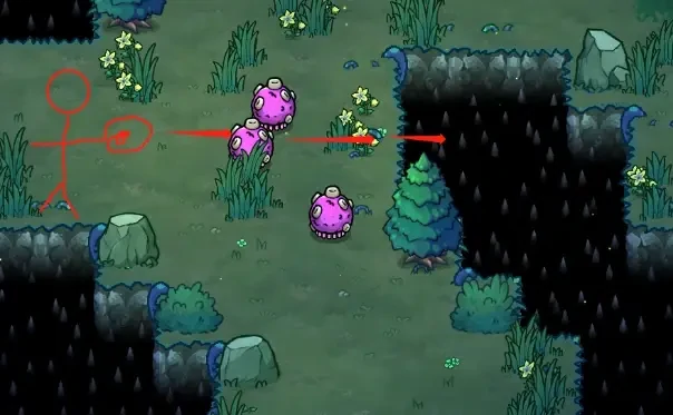 类似此处地形可解决敌人。此类小怪移动需空间,区域狭窄时易掉落下去。