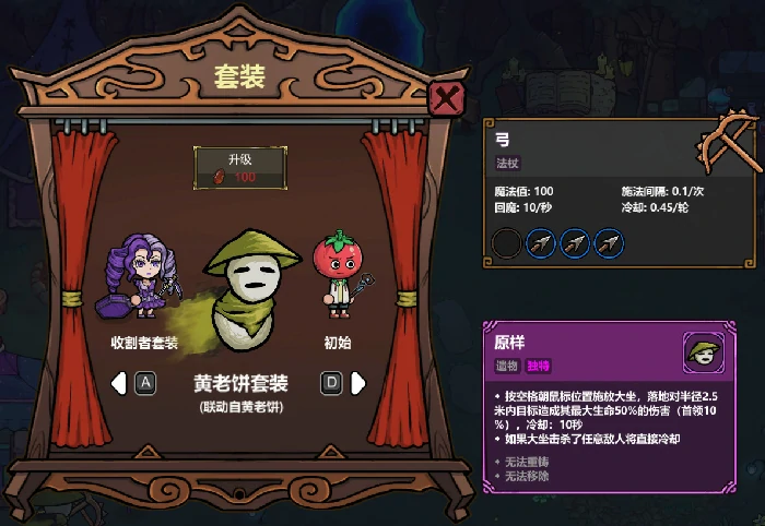 该套装配备弓型法杖,附带三个法术飞弹黄老饼的箭头,同时获得独特遗物原样,此遗物不可重铸或移除。