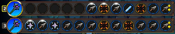 充能规则:每次正常施放黄老饼的箭头累积1点充能。多重施法、分裂、二重奏、连环、回响等效果不增加额外充能次数。仅绚丽花火可加速充能,将黄老饼的箭头放于其右侧,每次施法累积4点充能;采用绚丽花火 - 黄老饼的箭头 - 绚丽花火 - 黄老饼的箭头排列,单次触发累积16点充能。法术飞弹奥术新星能充能,技能描述释放20次,实际测试累积19点充能。