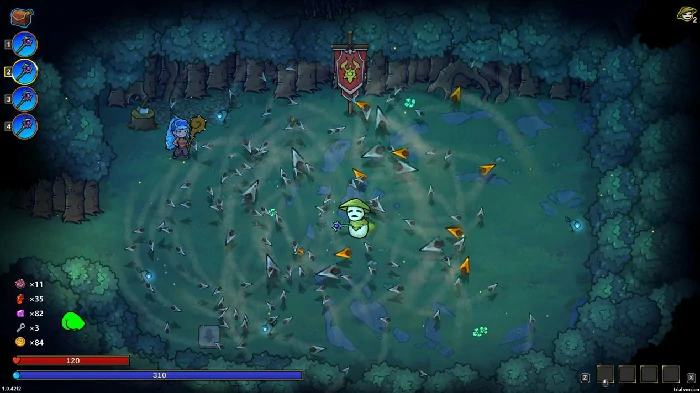 走量构筑:无需合成高等级箭头法术,将黄老饼的箭头填充多个法杖槽位,依靠其输出。利用后置槽位,搭配守护杖灵、共鸣符文等法术增强,组合绚丽花火与黄老饼的箭头,实现效果叠加提升收益,核心逻辑为射出普通箭头越多,触发大箭头越多。