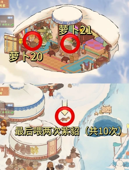 找到第五天2个小萝卜人,解锁全部21个收集。完成后,立即去喂紫貂。