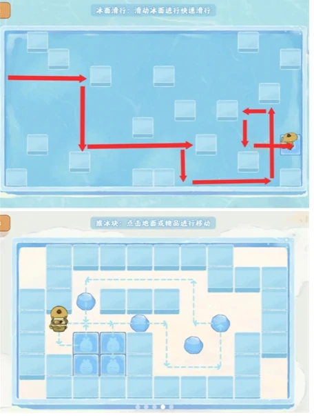 同步附上冰面滑行与推动冰块操作示意图,助力破解场景机关谜题。