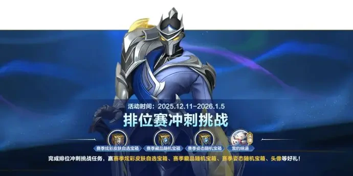 参与排位赛冲刺挑战解锁专属奖励,含赛季炫彩皮肤宝箱、赛季藏品宝箱、赛季姿态随机宝箱、限定头像等。