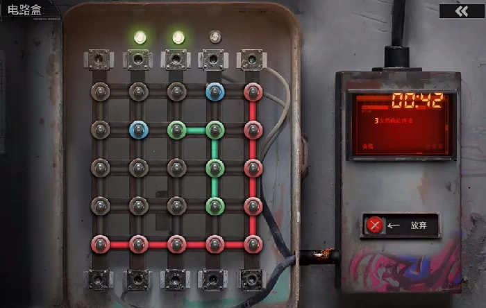 开启闸门后,进入一层室内。虽有储物箱和基础物资,但别停留。速上二层,在楼层中央找第一个电路控制盒。完成颜色连线解谜:相同颜色端口直线连接,线路不交叉。解谜成功得绿卡,这是进绿色权限区域唯一凭证。