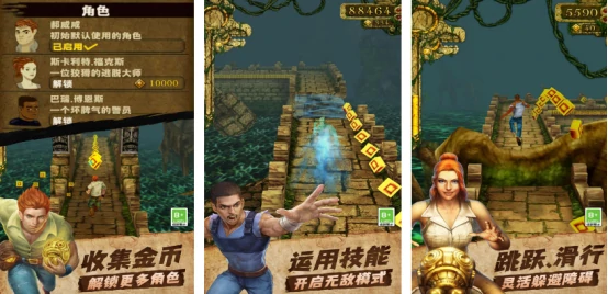 操作方式高度统一:左右滑动控制转向,上滑跳跃,下滑滑铲,倾斜设备收集路上金币。