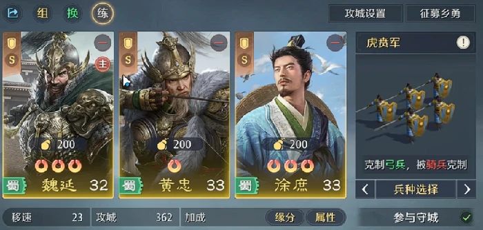 队伍同时在兵种、机制、环境、作战条件形成克制,少投入也能胜满红队。兵种和机制克制易掌握,难在作战条件和环境克制判断。第四套可选蜀国指挥盾,当前环境盾兵、枪兵主流,骑兵受限,蜀国指挥盾是好应对策略。