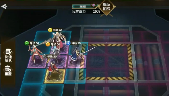阵容标配:1-2前排坦克,2输出(物理+魔法兼顾),1治疗辅助。前期用系统阵容,抽到高稀有度角色再换。比如出强力范围伤角色,就换输出位。