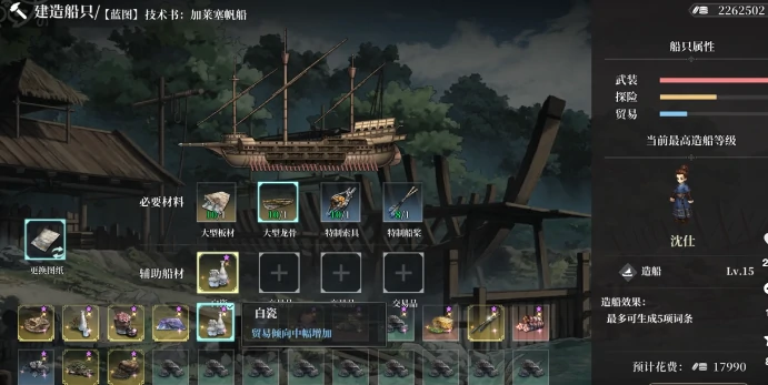 其他舰船材料各异:单桅纵帆船(灵活轻便,新手初期用),要桅杆、帆布、龙骨等基础材料;双桅横帆船(兼顾速度与载重),额外补通用板材;大型卡拉克帆船(远洋贸易用),需大型龙骨、特殊桅杆等,收集难度较高。