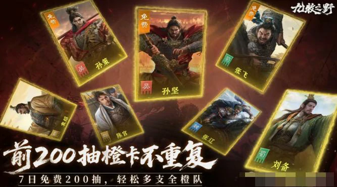 算上日常、限时活动、开服庆典,前7天共约200张点将券。前200次普通招募,保底不重复已拥橙色武将,降低开荒资源试错成本,助平民快速组主力阵容。
