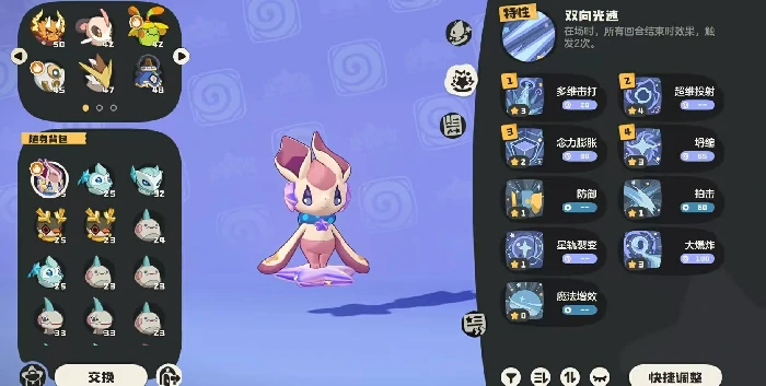 技能搭配上,粉星仔及其进化形态适合控制与持续输出路线,推荐学习“闪光”(降低对手命中)、“催眠尾巴”(使目标睡眠)、“星之雨”(中等威力魔法攻击)、“秘密力量”(增加战术变化)。此技能组合兼顾干扰与稳定输出,在道馆挑战、野外对战、部分活动关卡中表现均衡,适合新手过渡或专注图鉴养成的玩家。