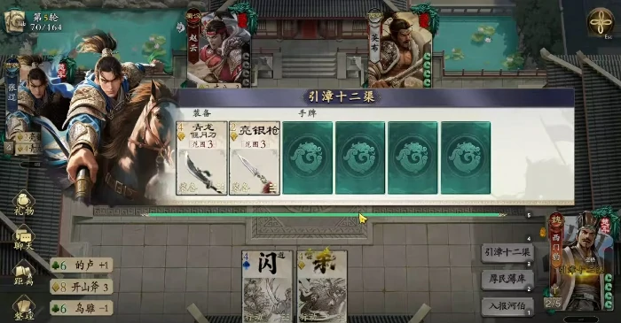 核心技能引漳十二渠:出牌阶段选1次,交黑桃牌给本轮未牌交换角色,换其1张牌(手牌/装备/判定区)。手牌无该黑桃花色牌,额外判定,非黑桃则摸1黑桃牌。开局交黑桃→换关键牌→判定得黑桃→为下轮交换准备,实现持续过牌与资源交换,持久战优势大。