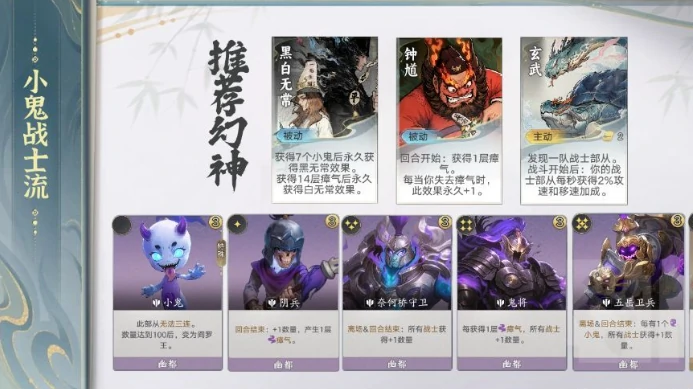 阵容核心选阴兵,每回合结束产瘴气,触发鬼将技能加战士数量。搭配奈何桥守卫、玄武、五岳卫兵加速战士成长。五岳卫兵战斗力随小鬼数量增加,小鬼需重点培养。幻神选黑白无常,快速积累小鬼,加快成型。