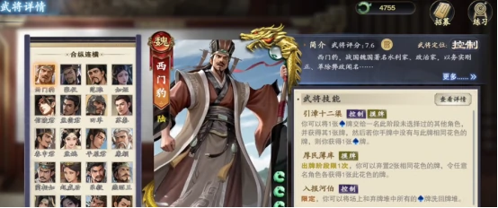 名将杀魏国新武将西门豹,5初始手牌,4体力上限,技能围绕黑桃牌,主打资源调配与团队配合,操作空间大,战术价值高。