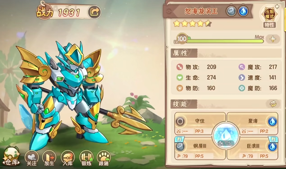 首先在配置这方面,小伙伴们需要携带一个圣光宝蛇,不过不需要怎么练,它主要的作用是在开场的时候给费尔斯上一下威压。然后需要携带4只哈尼熊,其中一只需要提升到100级,其他的差不多就可以了,哈尼熊在这个配置里最主要的作用是给队伍里的其他英雄加属性。最后需要带上一个海王。海王这个配置在队伍中占据的是主c的位置,因此它的魔攻至少要达到217。