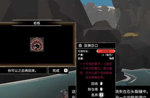 奖励是一个更强的蟹笼“深渊巨口”,这是一个6×6的蟹笼,虽然单次捕捉量有略微降低,但是耐久高,可以放那里很久,大约是11天,这样能提升后期捕捞的效率,是升级渔具的重要装备之一。