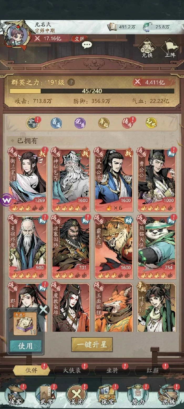 提升境界:耗江湖阅历修习,增强攻击、防御、气血属性。单项属性达修习上限后,集三属性突破境界,武力飞跃。