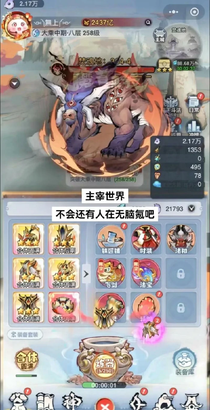 主线第九章通关,开装备系统。炼器石能造装备,多炼器升炼器等级,高等级出高稀有度装备概率大;炼器等级到结丹、元婴等品阶,单次炼器可投炼器石上限提高。