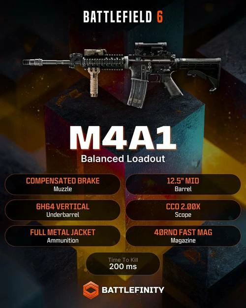 C档:M4A1——2级新手枪,推荐补偿制退器+12.5英寸枪管+40发快速弹匣,全金属被甲弹提升穿掩体伤害