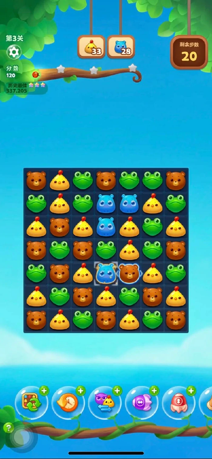 消除同色动物方块,每关目标不同,布局难度升级,灵活运用策略。使用魔力鸟、直线特效、爆炸特效等道具,助力闯关。
