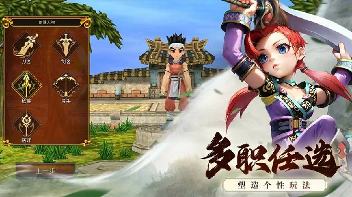 选职业:刀客——血厚防高,近身搏斗;剑客——攻击凌厉、闪避出色,远程输出。挑顺手职业。