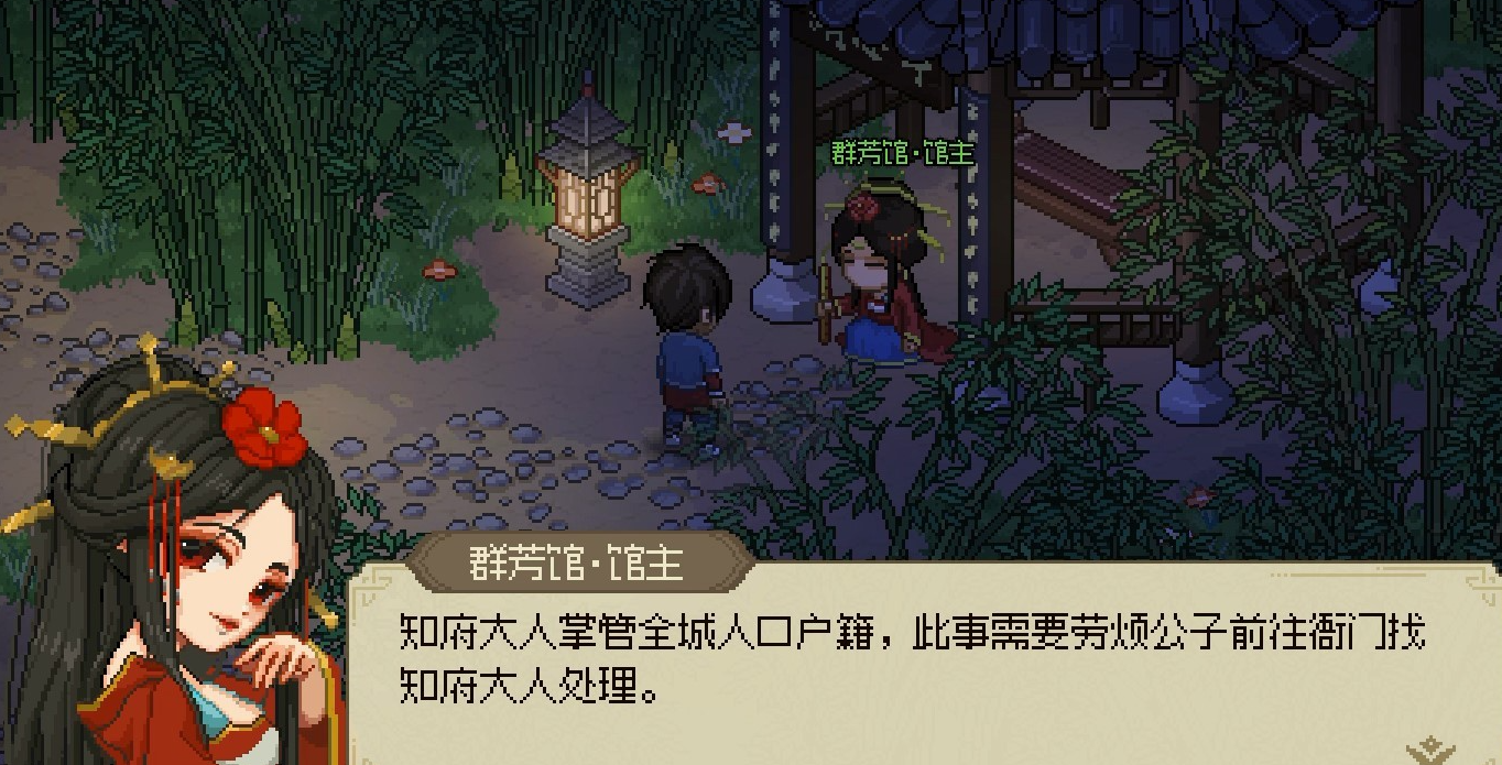 我们等到夜晚子时来到竹园的凉亭处进入剧情,通过对话得知原来她想要我们去找知府大人帮助恢复良籍,白天的时候直接来到衙门处和知府对话选择脱籍,如果此时我们是普通人就暂时无法继续推进该剧情,但是如果我们之前有在行辕大营解救宣和皇帝获得金牌令箭或者进入叶家军成为将军等有一定身份就可以继续推进。