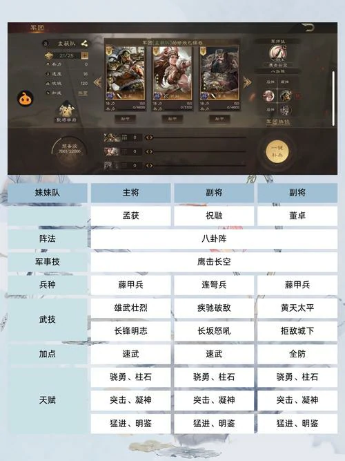 步兵:防御强、血厚,部署前线扛伤害。结阵化解骑兵冲击,用盾牌减伤。特殊步兵如藤甲兵,防火抗火系攻击。